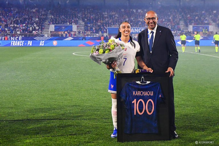 Arrivée en équipe de France à 20 ans, Sakina Karchaoui, évoluant du côté de Montpellier, a connu sa première cape le 11 avril 2016 lors d’un France-Ukraine (4-0). Dix plus tard, à l’occasion des éliminatoires de la coupe du monde féminine 2027, la joueuse de 30 ans, capitaine du PSG, atteint le chiffre de 100 sélections, ce soir, à Auxerre pour le match retour entre la France et les Pays-Bas.